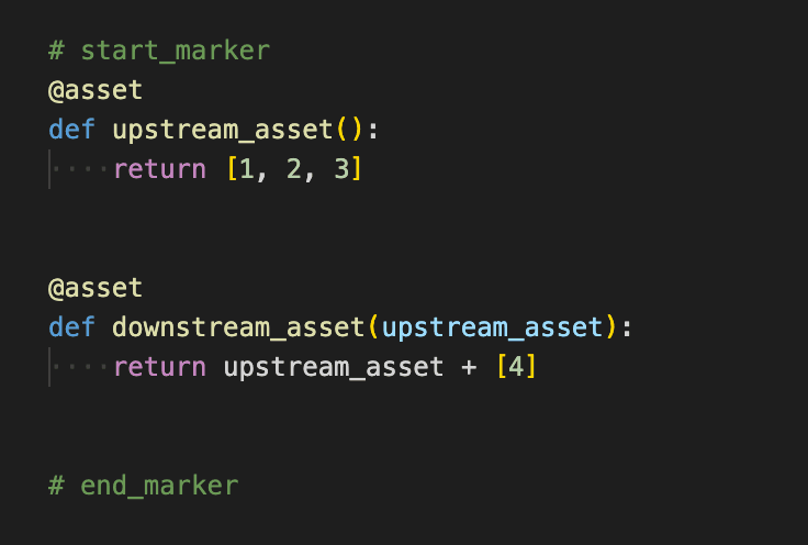 You can find the corresponding Python file at dagster/examples/docs_snippets/docs_snippets/concepts/asset/asset_dependency.py. The code included in each snippet is the code in the file between the # start_marker and # end_marker comments.